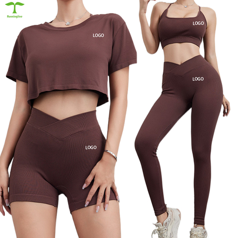Nuovo Set di allenamento Fitness da donna in morbido tessuto con sensazione di Nude reggiseno sportivo con maniche Crop Top pantaloncini da Yoga Leggings 3 pezzi Set da donna